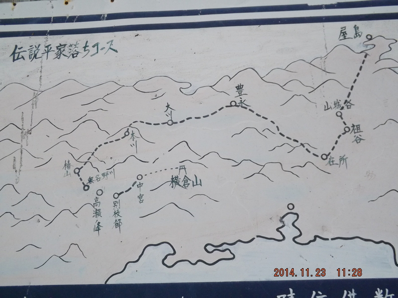 横倉神社に掲示されている安徳天皇四国潜幸のコース。すべてが深山幽谷の中である。