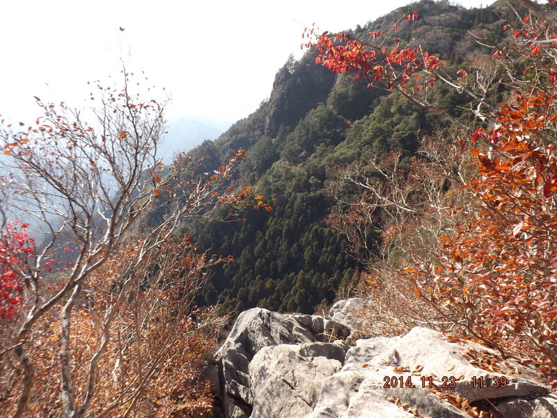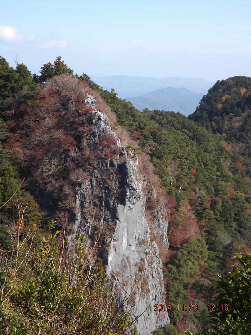 「畝傍山眺望所から見る馬鹿ためし。この断崖絶壁の基底部に「平家穴」がある。」
