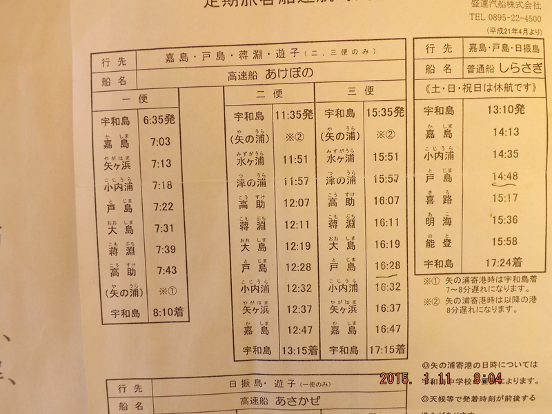 「戸島本浦の待合場の時刻表。朝7時についたが12時まで船は来ない。日曜日なので人っ子ひとりいない。島内には自動販売機一機以外にお店もない。4時間ほど瞑想するしかない(笑)。」