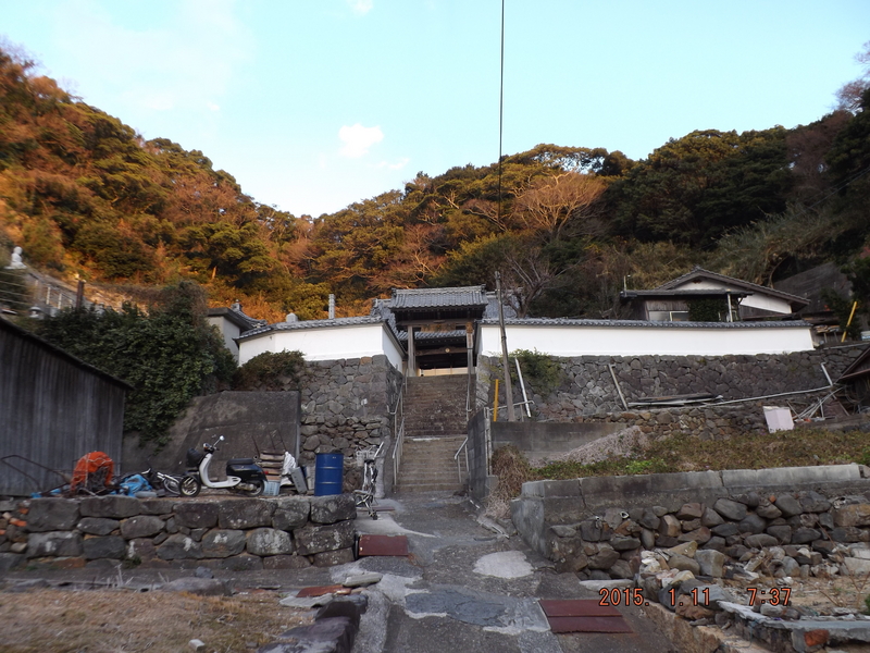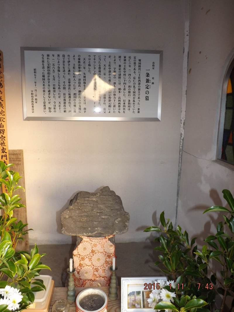 戸島は日振島同様に宇和海に浮かぶ小島である。 戦国時代、応仁の乱の難を逃れるために京都関白職より、領地であった土佐幡多荘中村に下向して戦国大名となった土佐一条家であったが、4代目領主の兼定の時に土佐長岡の豪族であった長宗我部氏より侵略を受けた。同時期に内部で起こった謀略によって兼定も土佐を追放され、舅親である豊後(大分県)のキリシタン大名大友宗麟を頼った。その間をついた長宗我部元親に領地の要である中村までも占領されてしまう。彼は豊後でキリスト教に入信しドン・パウロの洗礼名を受け、大友家より援軍をえて、十字の旗頭のもと九州から再び中村に攻め入ったのである。キリシタン大名一条兼定の誕生である。 しかし天下分け目の渡川(四万十川の旧名)の合戦で敗れた兼定は、長宗我部に脅された地元豪族達の寝返りにもあって四面楚歌となり、やむなく漁船に乗って臣下費50余名とともに伊予の戸島へ落ちのびたのである。戸島でも復讐の念を諦めきれず、ひそかに中村の国元へ使者を出し一門の家臣等や南予の諸将達と連絡し策を練ったで兼定であったが、この動きを耳にした長宗我部元親は、兼定の側近者を唆して暗殺を企てた。兼定は刺客の太刀で左肘を打ち落とされながらもこれを撃退し、その8年後に一条家最期の一人として数奇な一生を閉じるまで戸島で深い信仰生活を送ったという。 500年を経た今でも戸島の島民は、兼定公を想い、祠を建てて世話をしている。長宗我部側の歴史を綴った文献では愚将として記されているが、負けて島に流れてもなお旧臣や周辺の諸将の人望を集めていたこと、亡くなっても今に至るまでなお幡多地方の住民に愛されてきたことなどを考えると、実際にはひとかどの人物であったことが伺いしることができる。今のところ、再興のための武具や軍資金の発見はないが、これほどハードな人生の中、これほどの将であるからには、何処かになにかを秘蔵していたものと思われる。