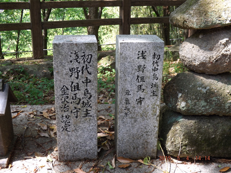 「神社内にあった戦国時代中鳥城の城主浅野但馬守の墓も移設されている。」
