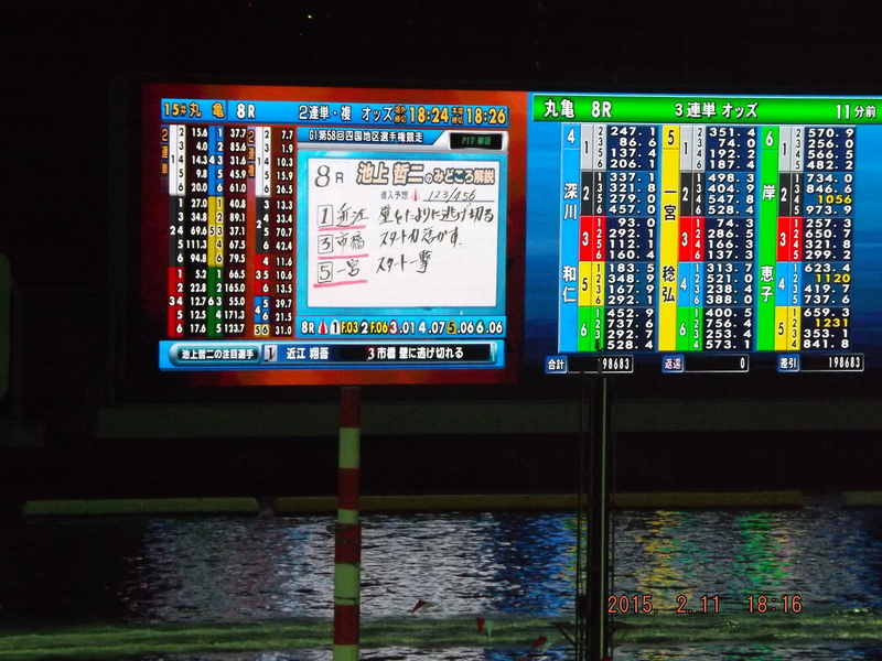 なお、この丸亀ボートは全国で5つあるナイター競艇場のひとつである。しかもその中では一番新しい。たとえ舟券を買う目的が無くても、有料シートに座りながらカクテルライトに照らされた海面を疾走するモーターボートを見ているだけで、なかなか楽しい娯楽でもある。