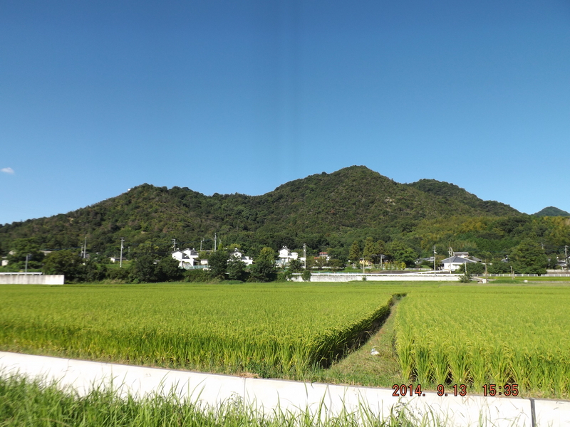 「南のまんのう町方向から見る城山。高いほうの峰が西長尾城跡。」