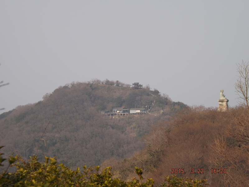 「島の南部の尾根から見る鷲ヶ峰。建物のあたりが鬼が島洞窟である。」