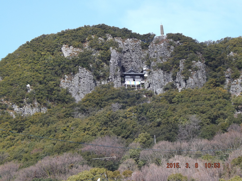 「北東部の笠ヶ滝から見る皇踏山。岩肌にへばりつく様に建立されているのは笠ヶ瀧寺。」